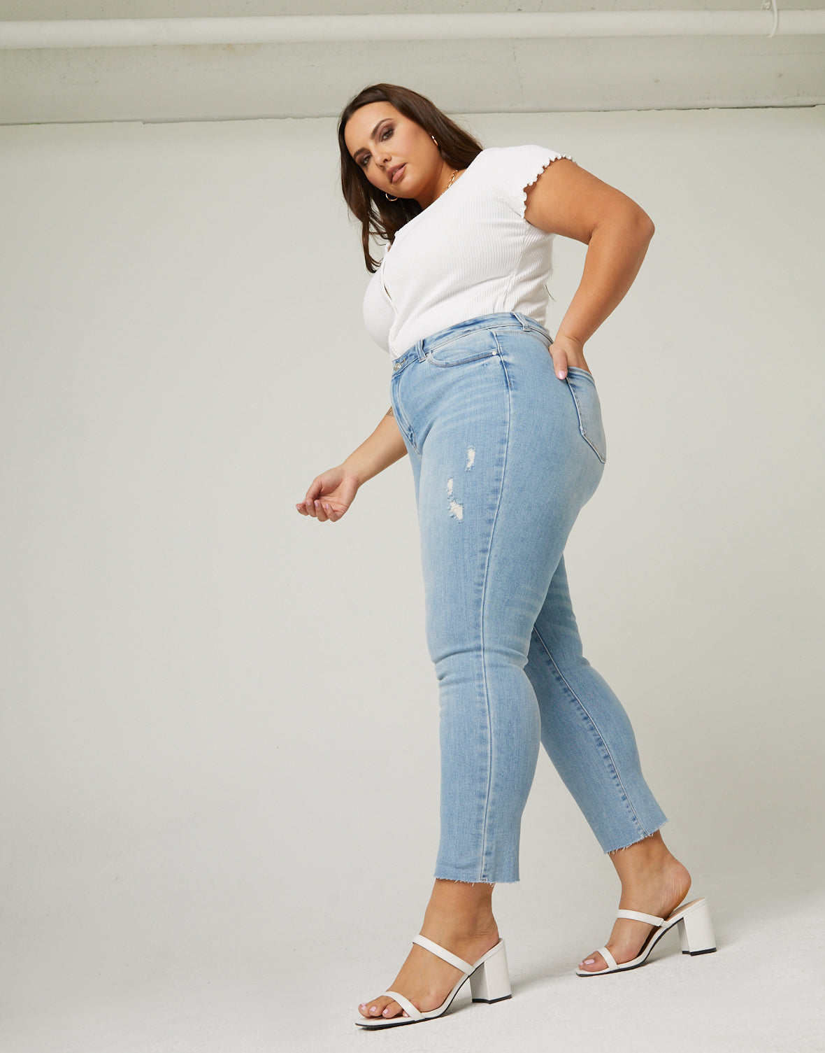- These jeans are high rise and slim legged, and feature a zipper and button fly, 5 real pocked, and stretchy denim with light distressing and raw hems.