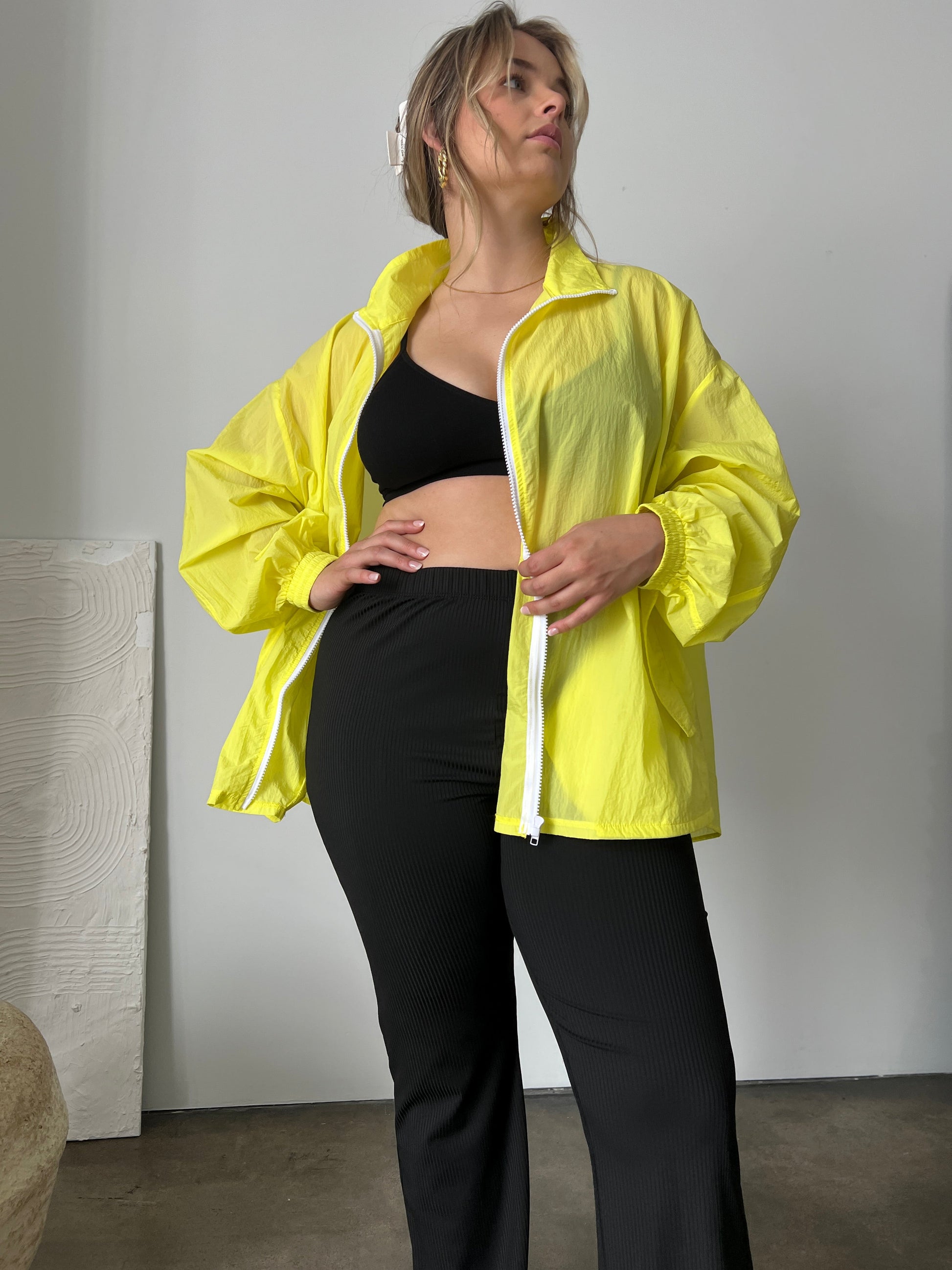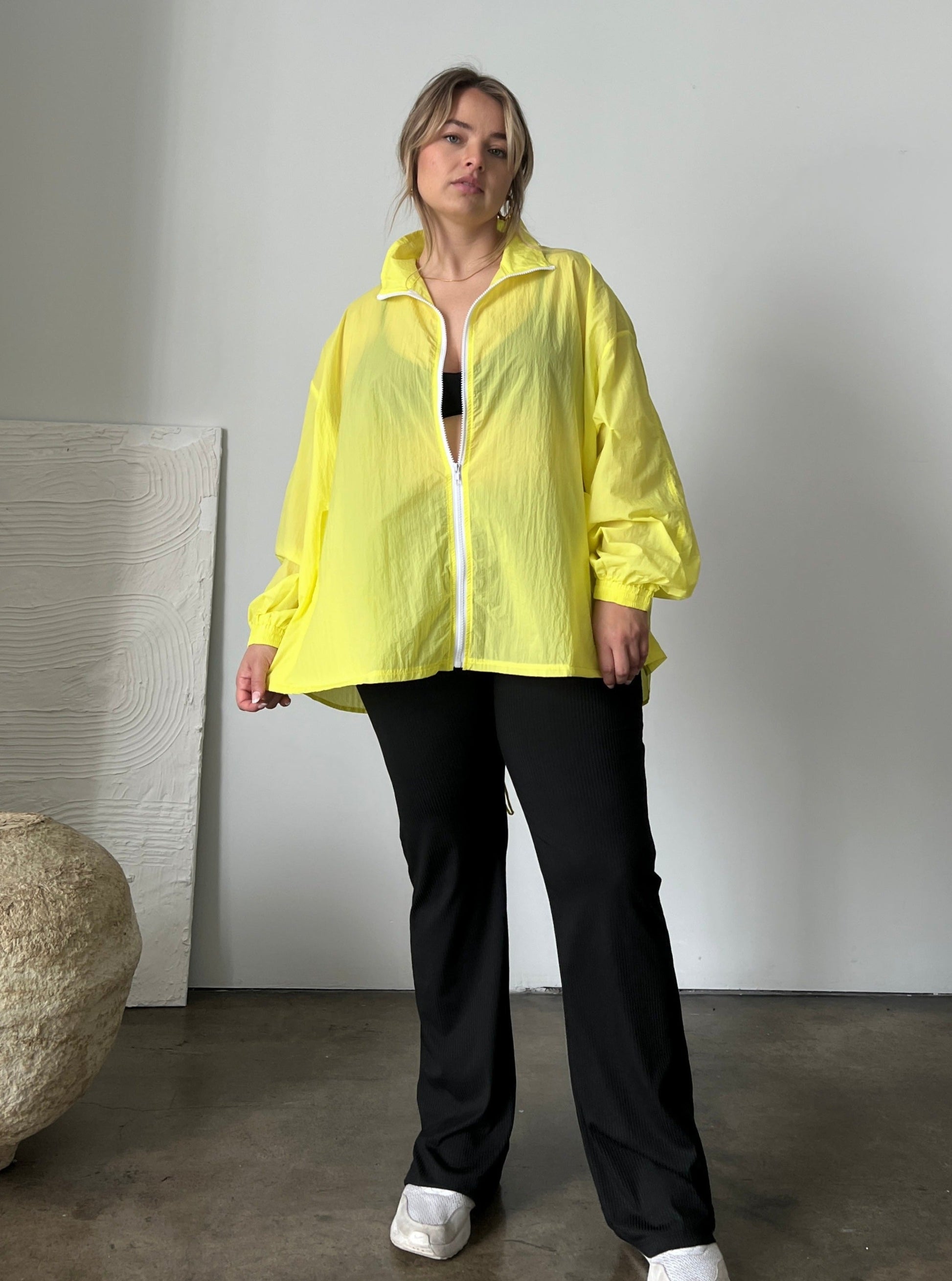 - This jacket?is made out of a lightweight, non-stretchy material and features a zipper up the front, long sleeves, two pockets, and elastic at the sleeve cuffs.