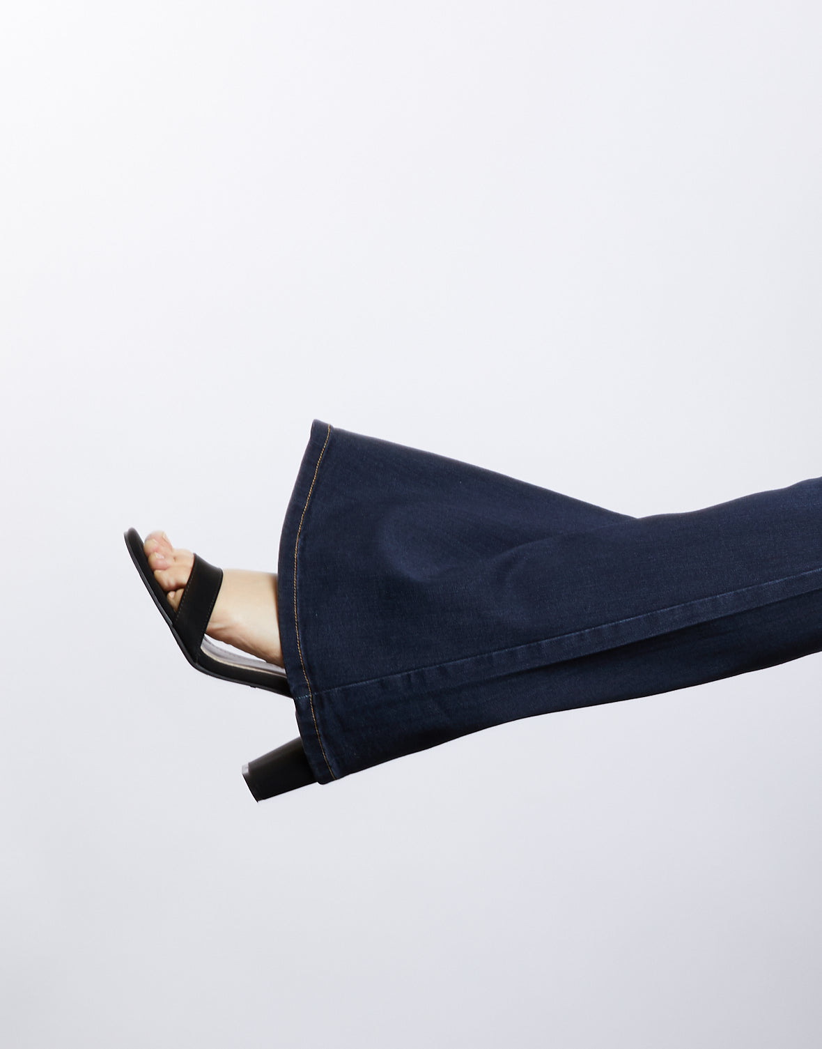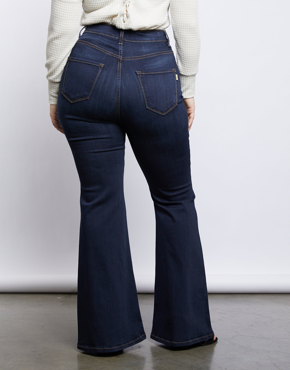 - Features a high-waisted cut that hugs the waist perfectly, a simple dark blue wash, and bell bottoms.?
